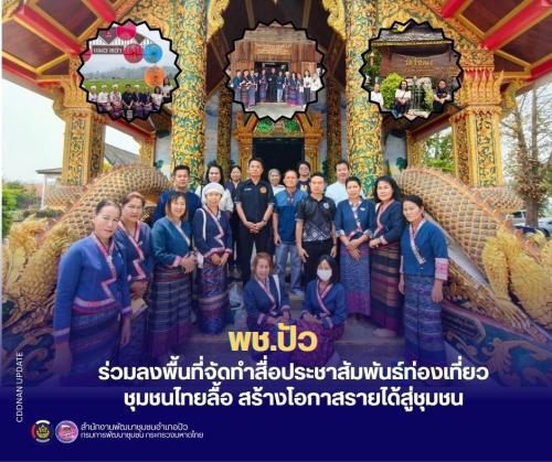 ในการนี้ ได้ลงพื้นที่ในชุมชนไทยลื้อ ได้แก่ บ้านร้องแง ตำบลวรนคร บ้านเก็ต ตำบลวรนคร และบ้านดอนไชย ตำบลศิลาแลง อำเภอปัว จังหวัดน่าน โดยมีวัตถุประสงค์เพื่อรวบรวมข้อมูลและจัดทำสื่อเผยแพร่ประชาสัมพันธ์แหล่งท่องเที่ยว วิถีชีวิต วัฒนธรรมท้องถิ่น รวมถึงผลิตภัณฑ์ OTOP ของชุมชน